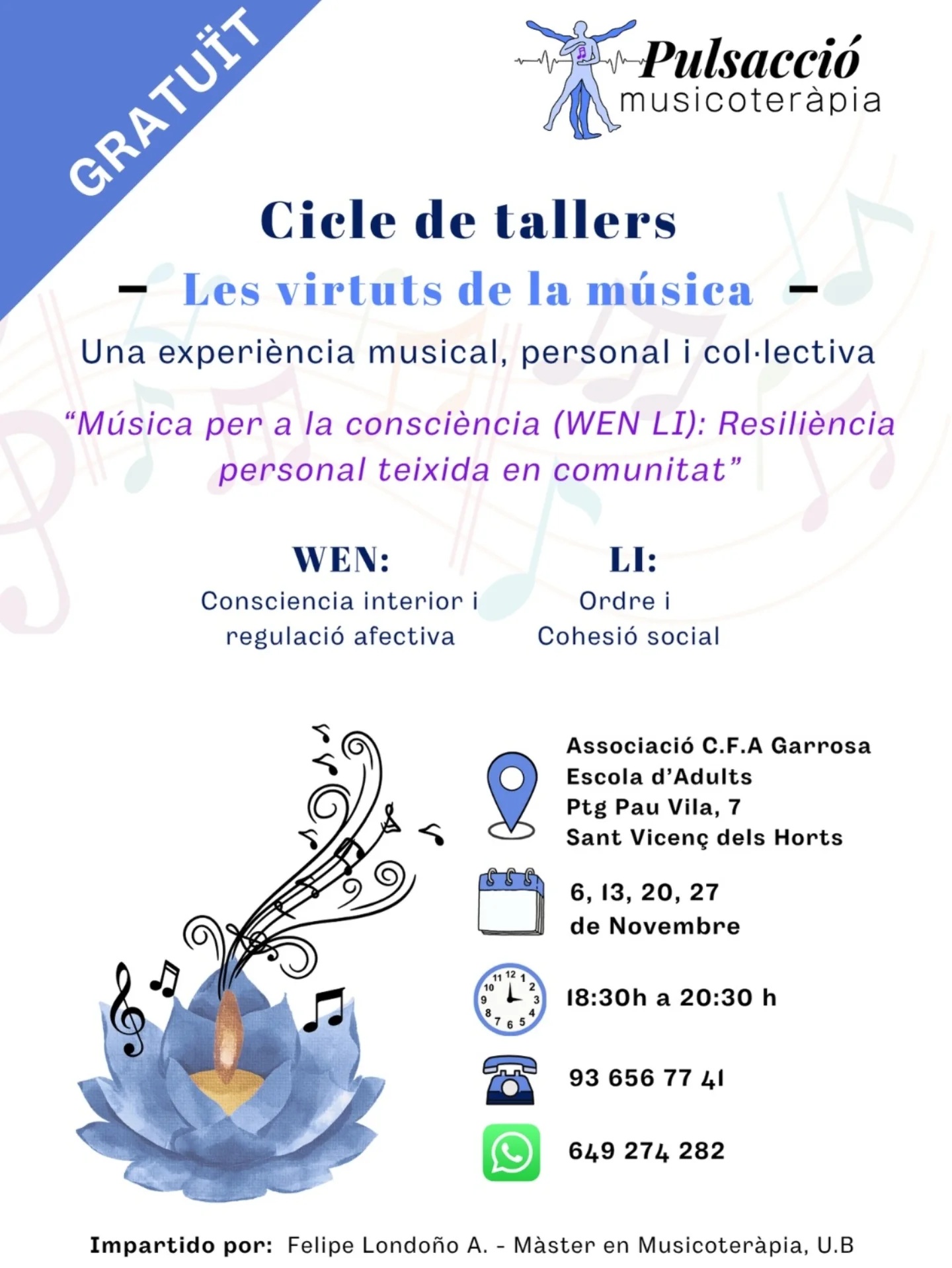 L’Associació d’Amics i Antics Alumnes de la Garrosa proposa un nou taller pels dijous de novembre: un cicle per treballar els beneficis de la musicoteràpia. Música per a la consciència (WEN LI): Resiliència personal teixida en comunitat. Amb Felipe Londoño.