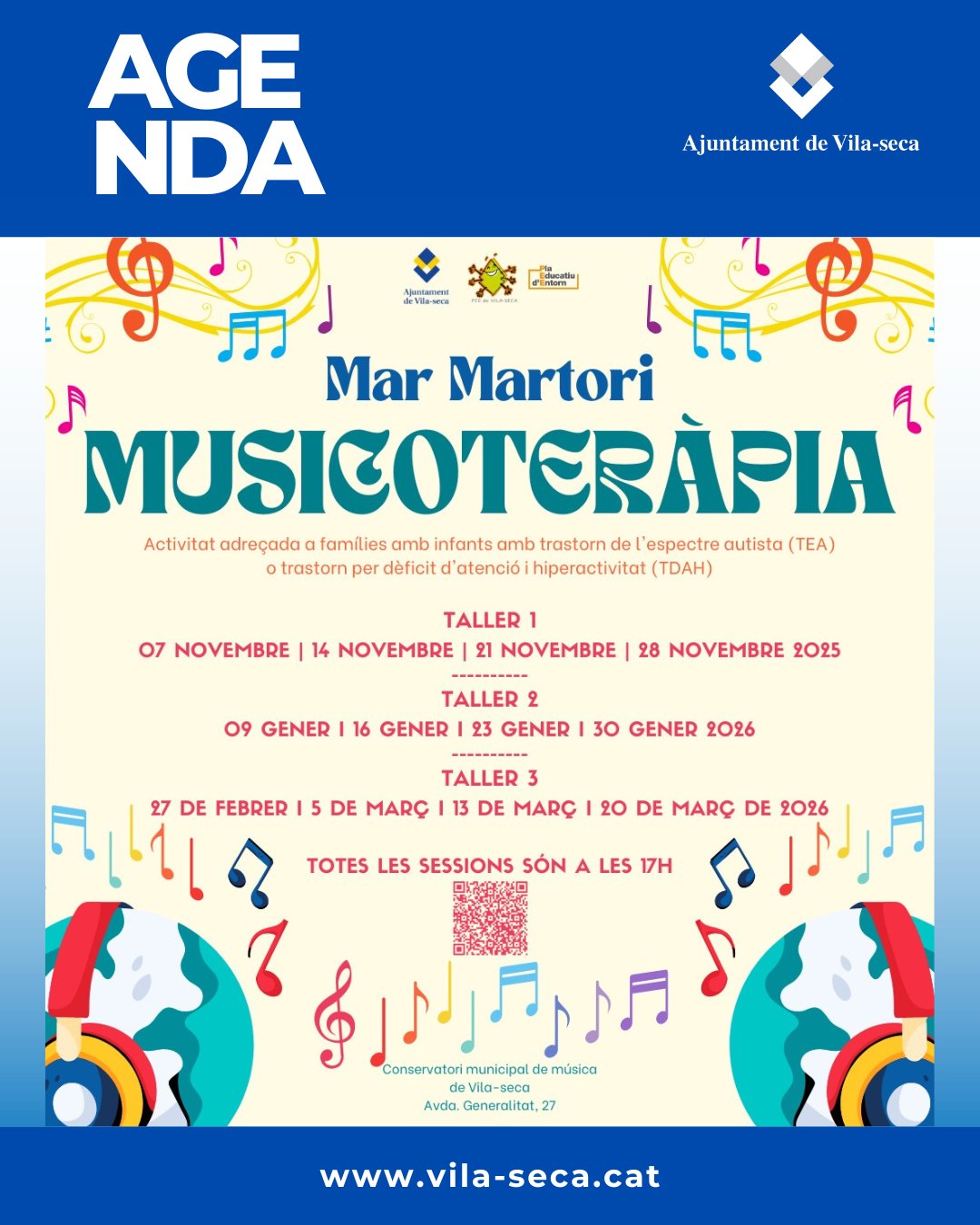 Tallers de musicoteràpia per a famílies amb infants amb TEA o TDAH. El poder de la música per connectar, relaxar i créixer junts. Taller 1 (7/11, 14/11, 21/11, 28/11) Taller 2 (9/01, 16/01, 23/01, 30/01) Taller 3 (27/02, 5/03, 13/03, 20/03). Tots ells a les 17h. Amb Mar Martori.